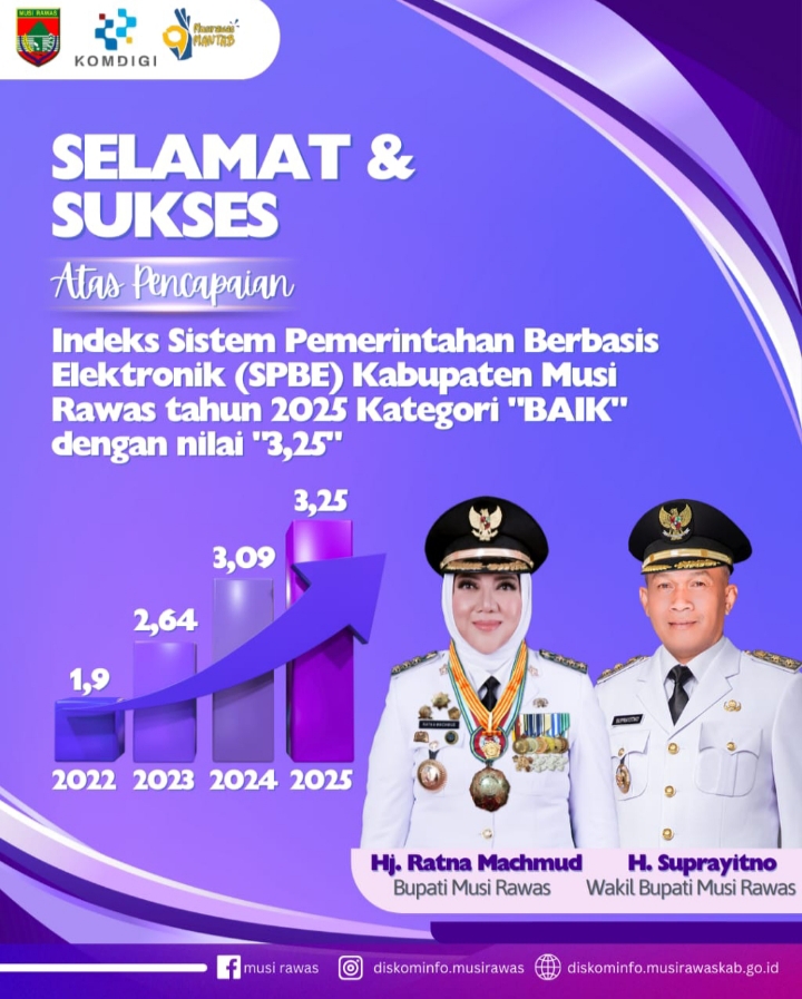 Detaksilampari.com, MUSI RAWAS – Pemerintah Kabupaten Musi Rawas mencatatkan capaian positif dalam penerapan Sistem Pemerintahan Berbasis Elektronik (SPBE) Tahun 2025. Berdasarkan hasil Pemantauan SPBE yang dilaksanakan Kementerian Pendayagunaan Aparatur Negara dan Reformasi Birokrasi (PANRB), Indeks SPBE Kabupaten Musi Rawas memperoleh nilai 3,25 dengan kategori Baik, nilai ini juga naik dari tahun sebelumnya 2024 di angka 3,09.