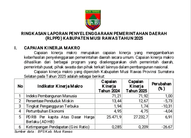 Maka bersama ini kami sampaikan kepada masyarakat Ringkasan Laporan Penyelenggaraan Pemerintahan Daerah (RLPPD) Kabupaten Musi Rawas Tahun 2025, sebagai berikut: