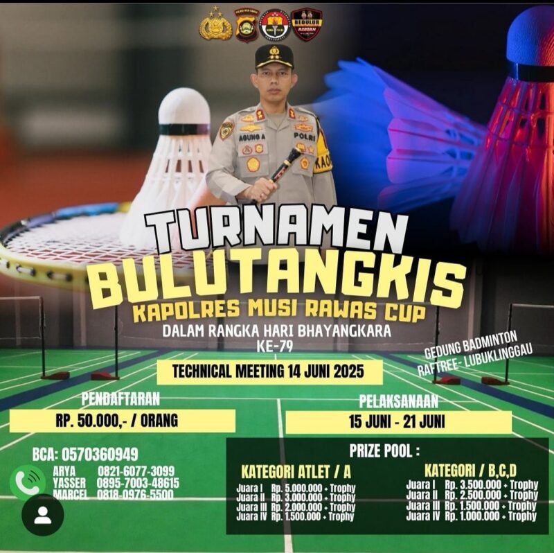 Detaksilampari.com, MUSI RAWAS – Dalam rangka memperingati Hari Bhayangkara ke-79, Polres Musi Rawas (Mura), menggelar Turnamen Bulutangkis Kapolres Musi Rawas Cup, di Gedung Badminton Rafree Lubuklinggau, dimulai, Minggu (15/6/2025), hingga, Sabtu (21/6/2025).